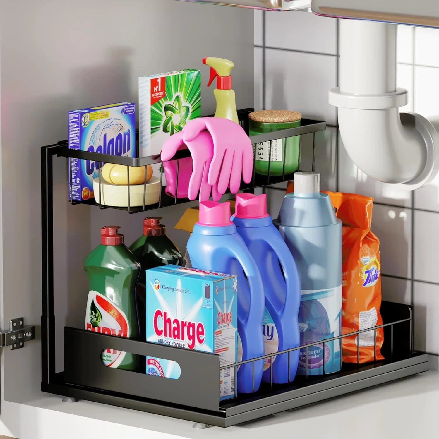 Двоярусна конструкція і нижня висувна полиця дозволяють зручно розміщувати побутову хімію, спеції, косметику, посуд, аксесуари і безліч інших речей. Компактний розмір 36×27×28 см при цьому забезпечує відмінну місткість, а міцна конструкція витримує навантаження до 22 кг. Установка не вимагає свердління — просто зберіть та встановіть органайзер там, де вам потрібно.